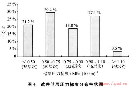 其中,嚴(yán)重欠壓儲(chǔ)層(儲(chǔ)層壓力梯度小于0.5MPa/100m)占21.2%,欠壓儲(chǔ)層(儲(chǔ)層壓力梯度介于0.5~0.75MPa/100m)占29.4%,略欠壓儲(chǔ)層(儲(chǔ)層壓力梯度介于0.75~0.90 MPa/100m)占18.8%,正常壓力儲(chǔ)層(儲(chǔ)層壓力梯度介于0.90~1.10MPa/100m)占27.1%,超壓儲(chǔ)層(儲(chǔ)層壓力梯度大于1.10MPa/100m)占3.5%(圖4)。儲(chǔ)層壓力梯度總體隨埋深的增加呈現(xiàn)出增大的趨勢(shì)(圖5)。
