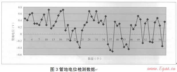 對整體管道的自然電位測試和原犧牲陽極保護(hù)系統(tǒng)進(jìn)行測試,大部分管道處在自然腐蝕電位狀態(tài)(-0.45V,Cu/CuS04參比電極),所測的60處管地電位在-0.49V~-0.72V之間波動(見圖3),其中正值占77%,最負(fù)值-0.49V,達(dá)不到管道陰極保護(hù)電位(即管/地界面極化電位)要求的-0.85V,即管道運行沒有處于陰極保護(hù)狀態(tài)。