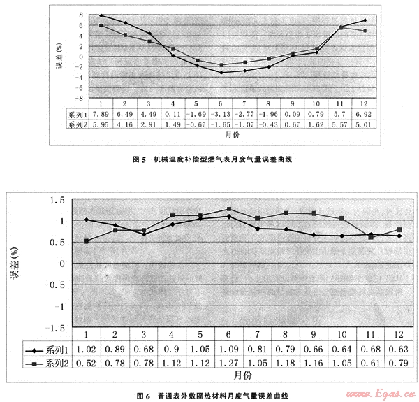 機(jī)械溫度補(bǔ)償型燃?xì)獗砭哂泻芎玫沫h(huán)境溫度修正功能,在冬季的修正誤差達(dá)到6%~8%,全年(統(tǒng)計(jì)時(shí)間10個(gè)月)累計(jì)修正誤差達(dá)到4%~5%。而我們過(guò)去進(jìn)行的戶外掛表區(qū)域計(jì)量輸差試驗(yàn)中,年度累計(jì)誤差約為-7%。因此,通過(guò)使用機(jī)械溫度補(bǔ)償型燃?xì)獗?,可以使輸差修正?2%左右,補(bǔ)償效果達(dá)到80%以上,同時(shí),從圖6可以看到,兩臺(tái)表的誤差曲線變化趨勢(shì)基本一致,說(shuō)明儀表的溫度補(bǔ)償有較好的一致性,通過(guò)近一年的試驗(yàn),儀表穩(wěn)定可靠,沒(méi)有出現(xiàn)故障,說(shuō)明儀表的穩(wěn)定性和可靠性基本滿足現(xiàn)場(chǎng)使用要求。