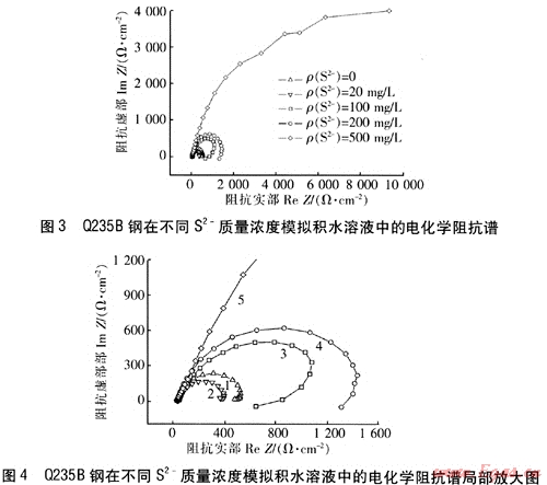 圖3為Q235B鋼在不同S2-質(zhì)量濃度的模擬積水溶液中的電化學阻抗譜,圖4為圖3的局部放大圖。