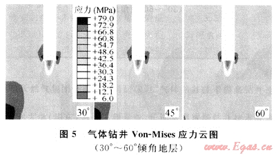 橫向比較分析不同傾角地層氣體鉆井和鉆井液鉆井的Von-Mises應(yīng)力變化趨勢,由圖3、圖4、圖5、圖6綜合分析可見:氣體鉆井井壁巖石在井底附近出現(xiàn)應(yīng)力集中,比鉆井液鉆井井壁巖石應(yīng)力值大,而且等值應(yīng)力分布面積更大,氣體鉆井比鉆井液鉆井更容易出現(xiàn)井壁不穩(wěn)定現(xiàn)象。氣體鉆井井底巖石相同等值線應(yīng)力區(qū)域面積較鉆井液鉆井應(yīng)力區(qū)域更深,巖石破壞范圍要大于鉆井液鉆井的破壞范圍,大大提高了破壞巖石效率和鉆井速度。在相同條件下,如果井眼軌跡發(fā)生偏斜,由于氣體鉆井具有較好的破巖效率,產(chǎn)生井斜可能性和幅度都更大。