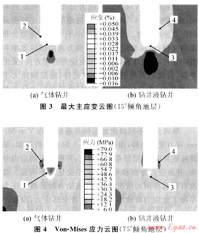 圖2中1、3區(qū)井底巖石被暴露出來后,地應(yīng)力釋放,產(chǎn)生新的應(yīng)力分布。由圖2中4區(qū),氣體鉆井的1區(qū)井底巖石的應(yīng)力分布有向左面偏斜,即沿向垂直于傾斜面的方向偏斜,而對于鉆井液鉆井,偏斜趨勢不明顯。氣體鉆井中1區(qū)井底巖石相同等值線應(yīng)力區(qū)域面積較鉆井液鉆井的應(yīng)力區(qū)域面積更大。