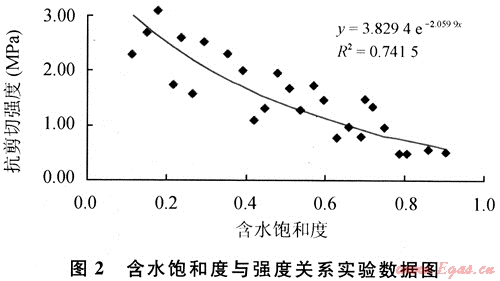 實驗樣品的抗剪切強(qiáng)度與含水飽和度(泥質(zhì)含量30%)回歸關(guān)系式(圖2)為: