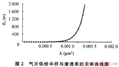 根據(jù)對不同滲流條件下的供給半徑定量研究表明(見圖2),滲透率小于1×10-3μm2的儲層,供給半徑在300m左右;當(dāng)滲透率大于1.2×10-3μm2時供給半徑就明顯增加。從圖2中看出:當(dāng)K介于1.2×10-3~1.4×110-3μm2,供給半徑為600~2000m;當(dāng)滲透率大于等于1.4×10-3μm2,供給半徑急劇增加,供給半徑在2000m以上。這說明氣藏的非均質(zhì)性對氣井供氣范圍影響大,井網(wǎng)密度應(yīng)不一樣。沙罐坪、云和寨北區(qū)、臥龍河石炭系氣藏大部分井滲透率小于1×10-3μm2,根據(jù)計算井距在300~2000km,從目前采出程度較高、非均質(zhì)性較強的福成寨、張家場石炭系來看,井距1~2km,從理論和實際開發(fā)效果對比認為,沙罐坪、云和寨北區(qū)、臥龍河石炭系氣藏平均井距在1km左右為最好。