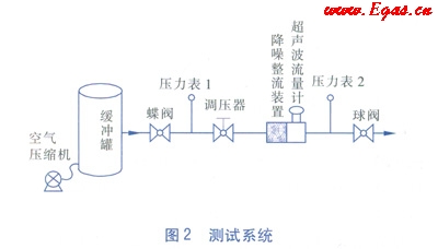試驗(yàn)中,用來產(chǎn)生超聲波噪聲的設(shè)備是調(diào)壓器。在氣體流動(dòng)的過程中,調(diào)壓器兩側(cè)的壓力差越大所產(chǎn)生的超聲波噪聲越大。本測(cè)試的方法是:在一個(gè)容積為5m3的緩沖罐中充入空氣,使其內(nèi)部達(dá)到500kPa左右的絕對(duì)壓力,緩沖罐的一側(cè)接有DN 50mm的管道,管道上依次接有蝶閥、壓力表1、調(diào)壓器、降噪整流裝置、AS超聲波流量計(jì)、壓力表2和球閥。為了模擬實(shí)際使用現(xiàn)場(chǎng),特約束了它們之間的距離。蝶閥與壓力表1相距10D(D為管道公稱直徑),壓力表1與調(diào)壓器相距15D,調(diào)壓器與降噪整流裝置相距5D,降噪整流裝置與AS超聲波流量計(jì)直接連接,超聲波流量計(jì)與壓力表2相距10D,壓力表2與球閥相距10D,測(cè)試系統(tǒng)見圖2。選用的AS超聲波流量計(jì)規(guī)格為DN 50mm,始動(dòng)流量為0.37m3/h,流量范圍為3~150m3/h。