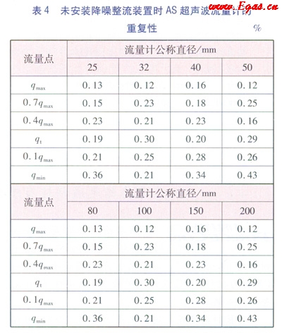 據(jù)國家質(zhì)量監(jiān)督檢驗(yàn)檢疫總局發(fā)布的超聲波標(biāo)準(zhǔn)JJG 1030—2007《超聲流量計(jì)》的要求,的重復(fù)性不能超過相應(yīng)準(zhǔn)確度等級(jí)規(guī)定的最相對(duì)誤差絕對(duì)值的1/5,即作為1.5級(jí)的AS流量計(jì)的重復(fù)性,除分界流量點(diǎn)(qt)以下的應(yīng)滿足重復(fù)性≤0.6%外,其他流量點(diǎn)應(yīng)滿足≤0.3%。流量計(jì)的重復(fù)性越小,性能越好。析表3和表4中的數(shù)據(jù),安裝降噪整流裝置的As超聲波流量計(jì)的重復(fù)性比不安裝降噪整流裝置的超聲波流量計(jì)的重復(fù)性要小很多,達(dá)到0.5級(jí)AS超聲波流量計(jì)的重復(fù)性的要求。試驗(yàn)證明降噪整流裝置的整流效果在超聲波流量計(jì)的重復(fù)性方面也能體現(xiàn)。