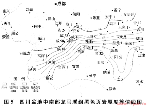 下古生界黑色頁巖集中分布在下寒武統(tǒng)筇竹寺組、下奧陶統(tǒng)大灣組和五峰組及下志留統(tǒng)龍馬溪組等4個層段中。大灣組(或大乘寺組)黑色頁巖在盆地西南部較發(fā)育,其厚度一般在45~140m,特別是在威遠地區(qū)分布穩(wěn)定,也是未來下古生界頁巖氣勘探值得重視的一套目的層。五峰組黑色頁巖雖分布穩(wěn)定,但厚度較薄,一般只有幾米,且與龍馬溪組整合接觸,特征類似。限于資料,筆者僅針對筇竹寺組和龍馬溪組兩套黑色頁巖開展分析與討論。