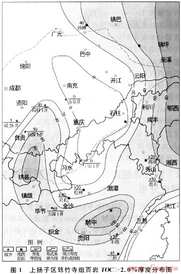 據(jù)Charles Boyer等(2006)[5]把源巖有機質(zhì)豐度定為6級,即TOC<0.5%為很差;0.5%~1%為差;1%~2%為一般;2%~4%為好;4%~12%為很好;TOC>12%為極好。美國從事頁巖氣藏勘探開發(fā)的油公司一般將有效頁巖TOC含量下限值確定為2.0%。筆者采用這一下限值,并依據(jù)上揚子區(qū)下寒武統(tǒng)筇竹寺組頁巖TOC含量實測標定資料及相應(yīng)厚度分布,編制了該區(qū)筇竹寺組頁巖TOC≥2.0%的頁巖厚度分布圖(見圖1)。