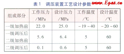 壓縮天然氣氣瓶車在母站充裝壓縮天然氣后通過(guò)公路運(yùn)輸進(jìn)入CNG儲(chǔ)配站,通過(guò)專用高壓軟管與卸氣柱相連,氣瓶車內(nèi)的壓縮天然氣經(jīng)調(diào)壓裝置調(diào)壓后送入燃?xì)夤芫W(wǎng)供用戶使用。具體過(guò)程為:進(jìn)口壓力約22MPa的壓縮天然氣經(jīng)過(guò)裝置入口高壓球閥、過(guò)濾器、緊急切斷閥后,在一級(jí)加熱裝置進(jìn)行加熱,加熱后的壓縮天然氣經(jīng)過(guò)一級(jí)調(diào)壓設(shè)備,壓力降為5.6MPa,然后進(jìn)入二級(jí)加熱裝置,加熱后的天然氣再經(jīng)過(guò)二級(jí)調(diào)壓設(shè)備,壓力降為0.1MPa,進(jìn)入城鎮(zhèn)中壓管網(wǎng)。調(diào)壓裝置工藝設(shè)計(jì)參數(shù)見(jiàn)表1。
