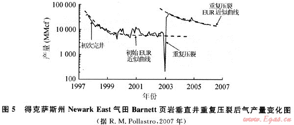 當(dāng)頁巖氣井初始壓裂處理已經(jīng)無效或現(xiàn)有的支撐劑因時間關(guān)系損壞或質(zhì)量下降,導(dǎo)致氣體產(chǎn)量大幅下降時,重復(fù)壓裂能重建儲層到井眼的線性流,恢復(fù)或增加生產(chǎn)產(chǎn)能,可使估計最終采收率提高8%~10%,可采儲量增加60%,是一種低成本增產(chǎn)方法。該方法有效地改善單井產(chǎn)量與生產(chǎn)動態(tài)特性,在頁巖氣井生產(chǎn)中起著積極作用,壓裂后產(chǎn)量接近甚至超過初次壓裂時期。美國天然氣研究所(GRI)研究證實,重復(fù)壓裂能夠以0.1美元/mcf(1mcf=28.317m3)的成本增加儲量,遠(yuǎn)低于收購天然氣儲量0.54美元/mcf或發(fā)現(xiàn)和開發(fā)天然氣儲量0.75美元/mcf的平均成本[16]。如圖5所示,得克薩斯州Newark East氣田Barnett頁巖新井完井和老井采用重復(fù)壓裂方法壓裂后,頁巖氣井產(chǎn)量與估計最終可采儲量都接近甚至超過初次壓裂時期(圖5)[17]。