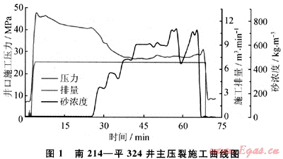 由于炮眼磨損引起的施工壓力變化在限流法壓裂施工曲線中有很明顯的顯示,圖1是南214-平324井的主壓裂施工曲線,從圖中可以看出支撐劑到達井底后,井口壓力大幅度下降,這在其他壓裂方式中是沒有的現(xiàn)象。此現(xiàn)象是由于支撐劑加入引起的混砂液凈液柱壓力、管柱摩阻和孔眼摩阻的變化綜合作用的結果。根據(jù)南214-平324井的井身結構及施工情況定量計算出前兩項的值[6~7],可以發(fā)現(xiàn)它們對施工壓力的影響遠沒有這么大,因此可以判斷出現(xiàn)施工壓力如此大幅度降低的主要原因是孔眼受支撐劑打磨孔徑變大后,摩阻急劇降低造成的,但目前的壓裂設計軟件還不能模擬孔眼摩阻的動態(tài)變化對裂縫形態(tài)的影響。