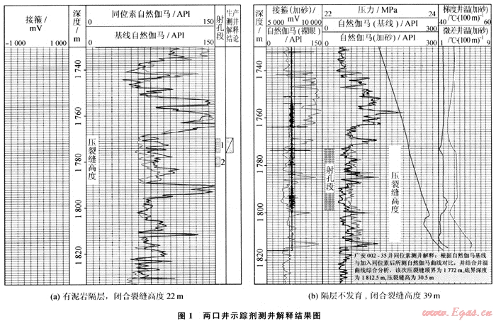 在壓裂施工中加入示蹤劑,通過(guò)壓后井溫度測(cè)井和示蹤劑確定縫口裂縫高度。通過(guò)對(duì)裂縫高度測(cè)量,可以對(duì)泥巖隔層的遮擋性和儲(chǔ)層裂縫高度延伸規(guī)律進(jìn)行研究,進(jìn)一步優(yōu)化壓裂設(shè)計(jì),與壓裂數(shù)據(jù)共同分析,確定裂縫有效幾何形態(tài)(圖1)。