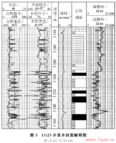 LG23井,試驗(yàn)(氮?dú)?井段3130.00~3683.00m。該井用自動取樣裝置所取巖樣(每4m取1個樣)建立的錄井剖面,與測井解釋剖面符合率為87%(圖3)。