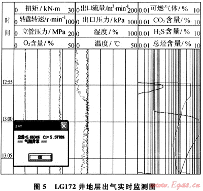 LG172井,2009年11月28日氮?dú)忏@進(jìn)在12:54時發(fā)現(xiàn)可燃?xì)怏w參數(shù)明顯升高,至12:58時井深3255.58m發(fā)現(xiàn)綜合錄井儀的氣測總烴含量明顯升高——含量由0.0723%↗6.6719%。“氣體鉆井實(shí)時監(jiān)測系統(tǒng)”連續(xù)彈出“氣測異常”報警對話框(圖5)。
