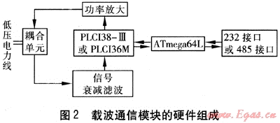 載波通信模塊的硬件組成見圖2。整個(gè)模塊的核心就是微控制器(Micro Control Unit,MCU)ATmega64L,它是美國(guó)愛特梅爾公司生產(chǎn)的AVR單片機(jī)。它芯片內(nèi)有64kb的程序儲(chǔ)存器(以下簡(jiǎn)稱FlashROM),4kb的靜態(tài)隨機(jī)儲(chǔ)存器(以下稱SRAM),2kb的電可擦除可編程只讀儲(chǔ)存器(以下簡(jiǎn)稱EEPROM),兩個(gè)通用異步收發(fā)器(以下稱USART),內(nèi)部還集成了看門狗。這些特點(diǎn)使這個(gè)MCU非常適合用在這個(gè)系統(tǒng)中。MCU的一個(gè)USART設(shè)計(jì)成232接口或485接口。另一個(gè)USART直接和PLC138-Ⅲ或PLC136M的串口相連。MCU芯片內(nèi)的EEPROM可以儲(chǔ)存一些掉電非易失數(shù)據(jù)[1]。