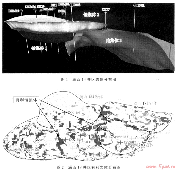 滴西14井區(qū)為多錐型復合火山機構,以爆發(fā)相為主,經歷多期次噴發(fā)及水流搬運沉積,形成3個火山巖體(圖1),對應3個儲集體,具有“兩弱一強”的地震反射特征,有利儲層為爆發(fā)相的火山角礫巖儲層(儲集體1和儲集體2)。