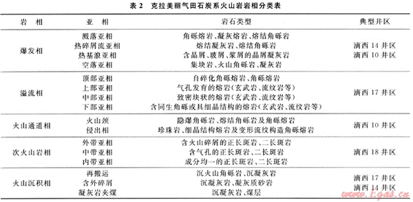 克拉美麗氣田石炭系屬于以中心式為主、裂隙式為輔的火山噴發(fā)模式,共發(fā)育3大類11種亞類32種巖石類型,包括爆發(fā)相的火山碎屑熔巖、熔結火山碎屑巖、火山碎屑巖,溢流相的玄武巖、安山巖、流紋巖,次火山巖相的正長斑巖、二長斑巖等?;鹕絿姲l(fā)能量較強,內部火山機構正向隆起特征清晰。