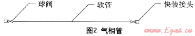 圖2為氣相管路,主要實現(xiàn)事故槽車、卸車壓縮機和搶險槽車的連接,主要由球閥、軟管和快裝接頭組成。由于設(shè)備及槽車所用快裝接頭皆為陽接頭,故軟管上所配接頭采用陰接頭。