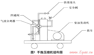 圖1所示的手推式壓縮機采用活塞式小型壓縮機,動力源采用手搖啟動式柴油隔爆發(fā)動機。四通閥主要用于改變管路中氣流前進方向,從而實現(xiàn)不拆卸情況下的輸送方向,滿足卸車和氣相回收的功能。壓縮機出口安裝有安全閥,當?shù)构尴掠螇毫^高時對壓縮機設(shè)備進行保護。整個橇體的進出口采用快裝接頭,使設(shè)備在現(xiàn)場的快速安裝成為可能。