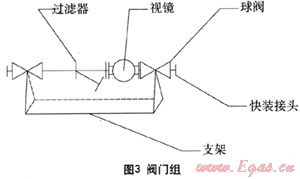 圖3所示閥門組主要是將一些液相管路上必須的設(shè)備集成在一個支架上以滿足進行快速的安裝需要。主要包括過濾器、視鏡、球閥、快裝接頭和支架。視鏡主要是用于觀測液相管路中液相輸送情況,其內(nèi)部自帶止回閥,可防止搶險槽車中的液相回流至事故槽車。