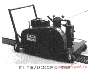 圖7手推式LPG卸車壓縮機可以實現(xiàn)在小片區(qū)域的人工改變位置,從而為小片區(qū)域的多個卸車點進行卸車;圖8為掛車式LPG卸車壓縮機,其中配備了更加齊全的附加設(shè)備,從而實現(xiàn)了大片區(qū)域的不同地點的卸車需求。目前該種移動式應急卸車設(shè)備在香港加德士石油公司、香港加德士石油公司、香港殼牌有限公司及汕頭加德士海洋燃氣有限公司配備使用,應該算作是用于搶險卸車的雛形狀態(tài)。