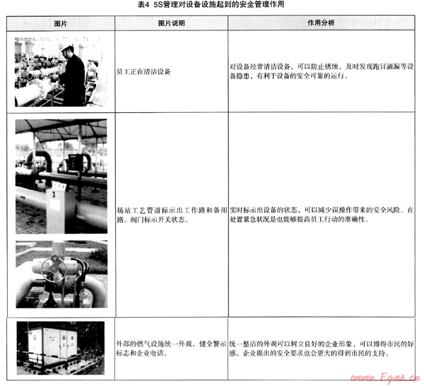 3.2.2燃?xì)庠O(shè)施遍布全市,不僅是場站之內(nèi)的設(shè)備設(shè)施,更多的中、低壓燃?xì)庠O(shè)施分布于全市各處公共場所。設(shè)備設(shè)施的安全可靠是企業(yè)安全管理的重要內(nèi)容。企業(yè)除了通過0HSAS18001制定出各種巡查、維護(hù)、保養(yǎng)工作規(guī)定和流程外,5S的目視管理,可進(jìn)一步增強設(shè)備的安全可靠性。見表4: