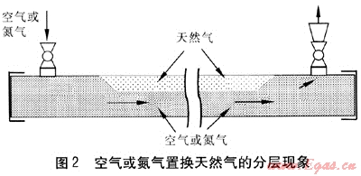 在置換過程中,將天然氣緩慢輸入到新建管道內(nèi),由于天然氣的密度小,相對(duì)密度一般為0.6左右,天然氣就會(huì)在管道的上部流動(dòng),而位于管道下部的空氣或氮?dú)饩蜁?huì)滯留在管道內(nèi)。當(dāng)檢測(cè)人員從出口取樣檢測(cè)時(shí),儀器會(huì)顯示體積分?jǐn)?shù)為100%的天然氣,如果此時(shí)停止置換,滯留在管道內(nèi)的空氣將與天然氣混合,非??赡苄纬杀ㄐ曰旌蠚怏w,在用戶使用時(shí)發(fā)生危險(xiǎn)。這種情況會(huì)給安全運(yùn)行帶來極大的隱患。