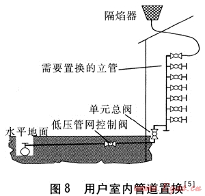 用戶管道系統(tǒng)置換中,需要完成從用戶支閥到建筑物外低壓管網(wǎng)控制閥的天然氣置換。一般這類置換管道長(zhǎng)度較短,管道總?cè)莘e較小,可以采用管道最遠(yuǎn)端置換的方法[6、7]。用戶室內(nèi)管道置換見圖8[5]。具體操作是將連接隔焰器的軟管連接于頂層用戶支閥,打開單元總閥進(jìn)行置換,置換過程中持續(xù)取樣監(jiān)測(cè),直至連續(xù)2次測(cè)得天然氣體積分?jǐn)?shù)達(dá)到95%以上或取樣中的氧氣體積分?jǐn)?shù)在2%以下即為合格[1](在英國(guó)的置換要求中,此數(shù)據(jù)為連續(xù)2次測(cè)得天然氣體積分?jǐn)?shù)達(dá)到90%以上或取樣中的氧氣體積分?jǐn)?shù)在4%以下即為合格[2]),停止放散,置換完成。