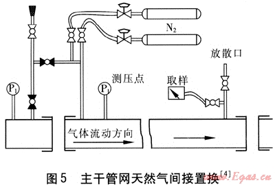間接置換方法具體操作過程是先將惰性氣體注入管道,在管道末端放散,使用惰性氣體置換出空氣,直至放散管取樣口惰性氣體的體積分?jǐn)?shù)達(dá)到預(yù)定的置換標(biāo)準(zhǔn)為止。在實(shí)際操作過程中一般用氧氣體積分?jǐn)?shù)來衡量,如果連續(xù)2次取樣中的氧氣體積分?jǐn)?shù)達(dá)到2%以下即為合格[1](在英國(guó)的置換要求中,此數(shù)據(jù)為連續(xù)2次測(cè)得取樣中的氧氣體積分?jǐn)?shù)達(dá)到4%以下即為合格[2]),停止通入惰性氣體。然后再將天然氣通入管道,同樣操作,在檢測(cè)管的取樣口取樣,用高精度燃?xì)鈾z測(cè)儀進(jìn)行實(shí)時(shí)的監(jiān)測(cè)分析,如果連續(xù)2次測(cè)得天然氣體積分?jǐn)?shù)達(dá)到95%以上即為合格[1](在英國(guó)的置換要求中,此數(shù)據(jù)為連續(xù)2次測(cè)得天然氣體積分?jǐn)?shù)達(dá)到90%以上即為合格[2]),置換完成。此法操作復(fù)雜、繁瑣,進(jìn)行2次換氣,不僅耗用大量惰性氣體還耗用大量的燃?xì)?,費(fèi)用較高,并且換氣時(shí)間長(zhǎng),工作量大。但是,它可以確保進(jìn)入管道內(nèi)的燃?xì)獠粫?huì)與管道內(nèi)空氣接觸,不會(huì)形成具有爆炸性的混合氣體。因此,此法可靠性好,安全系數(shù)高,成功率也高。主干管網(wǎng)天然氣間接置換見圖5[4]。