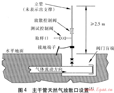 由于天然氣管道是封閉的,管道建成后經(jīng)歷了吹掃、強(qiáng)度試驗(yàn)、嚴(yán)密性試驗(yàn)等工序,管道內(nèi)沒有活動(dòng)部件,不可能因運(yùn)動(dòng)、撞擊產(chǎn)生火花??赡艹霈F(xiàn)的火源有以下兩種:一是高速氣流會(huì)因摩擦產(chǎn)生靜電,所以置換時(shí)要對(duì)管道系統(tǒng)進(jìn)行接地(見圖4[4]),即便有靜電負(fù)荷產(chǎn)生,也會(huì)立即通過接地裝置導(dǎo)入大地,不會(huì)有電荷積聚導(dǎo)致高電位而產(chǎn)生放電火花。二是高速氣流吹動(dòng)管道中可能殘留下來的石塊、鐵屑、焊條頭等固體物質(zhì),與管道內(nèi)壁碰撞產(chǎn)生火花。引起此類事故的根本原因是高速氣流,解決的關(guān)鍵是確保氣流的低速,這樣即便有石塊等雜物,也不會(huì)被吹動(dòng),也就不可能產(chǎn)生火花。此外,為了避免將雜物帶進(jìn)管道,應(yīng)事先在進(jìn)氣管道上設(shè)置過濾器。根據(jù)英國(guó)相關(guān)資料及國(guó)內(nèi)應(yīng)用經(jīng)驗(yàn),我們將置換管道用天然氣的氣流速度控制在最小置換流速以上,一般最大流速控制在3m/s以下。在置換過程中采用流速計(jì)或U型壓力表觀察管道升壓速度的辦法來測(cè)量其充氣流速,用閥門的開度來控制流速(混氣過程中控制閥前的壓力要保持穩(wěn)定)。