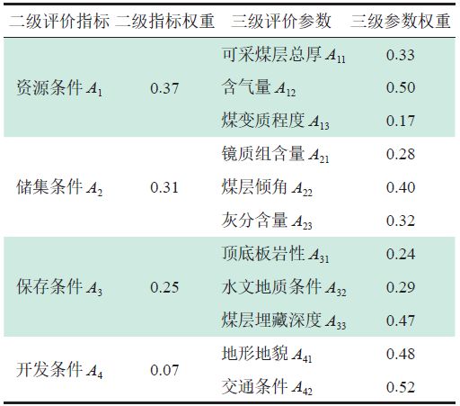 利用層次分析法對鎮(zhèn)威煤田各礦區(qū)中的煤層氣選區(qū)的關鍵要素進行定量排序, 將研究區(qū)煤層氣資源、儲集條件、保存條件和煤層氣開發(fā)基礎條件作為4 個二級評價指標,每個二級評價指標對于煤層氣開發(fā)的影響又受多個三級參數的影響,包括可采煤層總厚、含氣量、資源豐度、揮發(fā)分含量、鏡質組含量、煤層穩(wěn)定性、灰分含量、頂底板巖性、水文地質條件、煤層埋藏深度、地形地貌及交通條件(表3)。