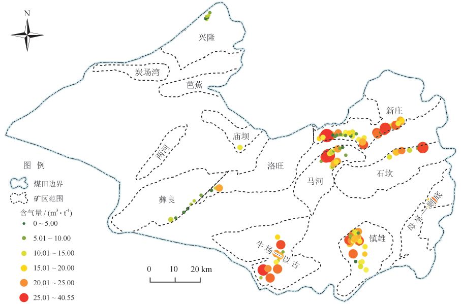 鎮(zhèn)威煤田煤層含氣量橫向上總體表現為東高西低的特征,彝良和廟壩礦區(qū)含氣量較低,一般不超過15 m3/t ;新莊礦區(qū)西部、馬河礦區(qū)、牛場—以古礦區(qū)和鎮(zhèn)雄礦區(qū)西北部煤層含氣量較高,一般介于9 ~ 18m3/t ;東部石坎礦區(qū)、母享—則底礦區(qū)及新莊礦區(qū)東部含氣量變化較大,一般介于5 ~ 20 m3/t,最大含氣量可達40 m3/t(圖3)。