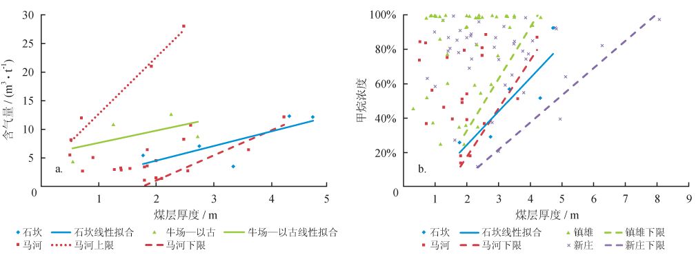 含氣量與煤厚大體上呈正相關關系,部分礦區(qū)含氣量與煤厚呈較明顯的線性正相關關系,如石坎礦區(qū)(相關系數R 為0.6)。較常見的情況是含氣量與煤層厚度之間存在一定的離散性,但其中煤層厚度與含氣量上限及含氣量下限同時存在較明顯的線性關系,如馬河礦區(qū)(圖5-a)。甲烷濃度的下限與煤厚普遍表現為正相關關系,反映煤層厚度的增加有助于煤層氣的保存(圖5-b)。總之,煤層厚度不僅控制了煤儲層的生氣潛力,對煤層氣保存也有一定影響,在煤層頂底板保存條件不理想的情況下,煤層厚度對含氣量的影響更為顯著。