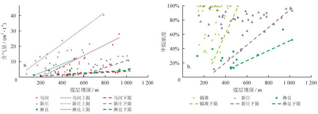 含氣量上限與煤層埋深關系呈正相關關系,含氣量下限則受煤層埋深影響較小,如馬河礦區(qū)和新莊礦區(qū)等(圖7-a),各礦區(qū)最大含氣量對應的埋藏深度自西向東增加,可能由于西部較高的地熱梯度使臨界深度變淺[16]。甲烷濃度下限與煤層埋深呈正相關關系,甲烷濃度下限受埋深影響的顯著程度可能受到煤層厚度、煤變質程度和頂底板保存條件的綜合約束(圖7-b)。