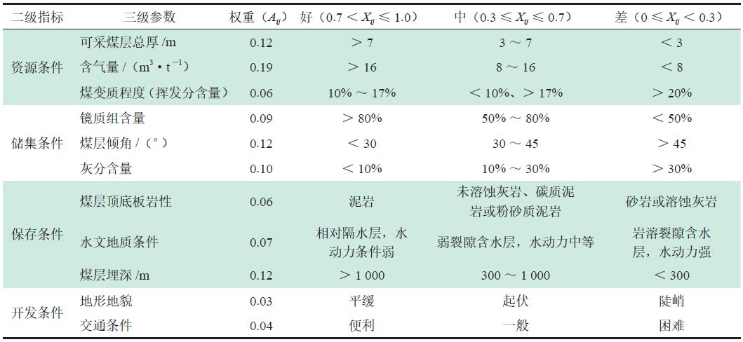 表3 鎮(zhèn)威煤田煤層氣選區(qū)評價參數及權重參數表