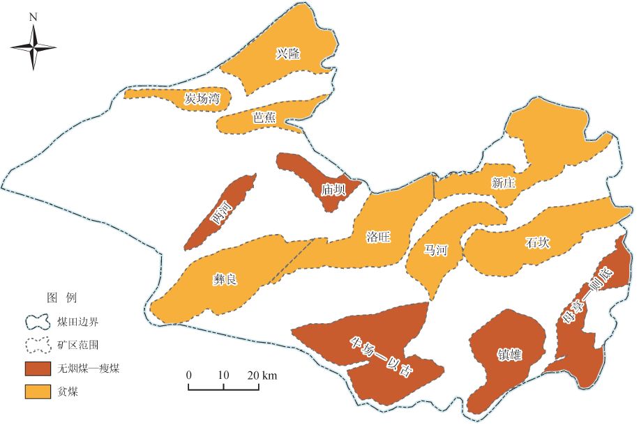 鎮(zhèn)威煤田煤變質程度相對較高,煤類以瘦煤、貧煤和無煙煤為主,揮發(fā)分含量介于2% ~ 28%,鏡質組最大反射率介于1.95% ~ 2.74%。受構造作用影響[13],最大變質程度分別達到貧煤與無煙煤的礦區(qū)表現為近東西向條帶在南北方向相間分布,無煙煤主要分布于母享—則底、鎮(zhèn)雄、牛場—以古以及兩河、廟壩礦區(qū),貧煤主要分布在石坎、新莊、馬河、彝良、洛旺以及興隆、炭場灣、芭蕉礦區(qū)(圖8)。