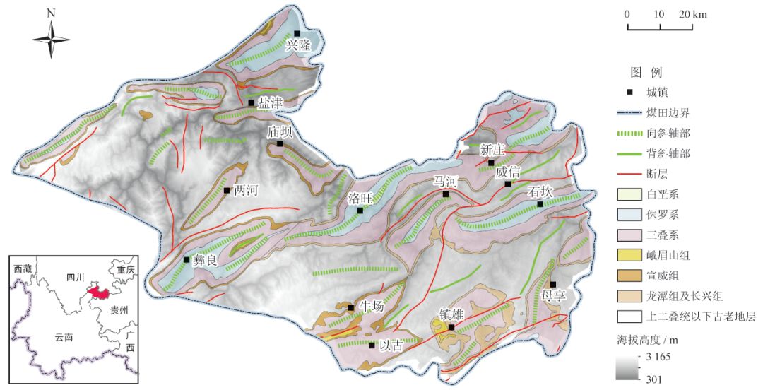 圖1 滇東北鎮(zhèn)威煤田區(qū)域位置及地質概況圖