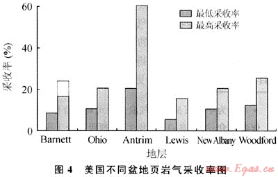 據(jù)美國5個主要頁巖氣產(chǎn)氣盆地的統(tǒng)計(jì),頁巖氣藏的采收率變化范圍為5%~60%(見圖4)。如埋藏較淺、地層壓力較低、有機(jī)質(zhì)豐度較高、吸附氣含量較高的Antrim頁巖氣藏的采收率可達(dá)60%;而埋藏較深、地層壓力較高、吸附氣所占比例相對較低的Barnett頁巖氣藏的采收率早期為7%~8%,隨著水平井和壓裂技術(shù)的進(jìn)步,目前的采收率達(dá)到16%,預(yù)計(jì)最終可達(dá)25%左右。