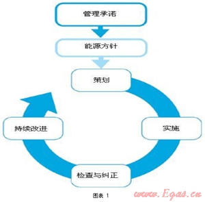 用能企業(yè)是實現(xiàn)能源節(jié)約的核心。在以節(jié)能減排為重要目標的指引下,企業(yè)使用任何能源,都應(yīng)制定一個基本的控制程序,形成一個有效能源管理體系運行模式。企業(yè)為兌現(xiàn)管理承諾和實現(xiàn)能源方針應(yīng)進行策劃-實施-檢查與糾正-持續(xù)改進(PDCA)等過程。圖示如下(圖表1):