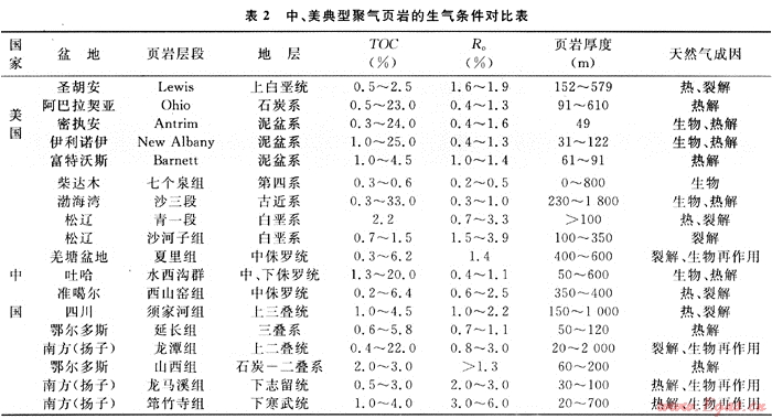 中國(guó)與美國(guó)在頁(yè)巖氣富集條件上具有許多相似之處,美國(guó)頁(yè)巖氣大規(guī)模的成功開發(fā)為中國(guó)的頁(yè)巖氣勘探研究提供了參考模式。在美國(guó),圍繞加拿大地盾南緣形成了廣泛的古生界海相沉積,后期的改造和演化形成了現(xiàn)今呈弧形展布的一系列盆地;在中國(guó),塔里木、華北和揚(yáng)子地臺(tái)及其周緣廣泛發(fā)育了不同地質(zhì)時(shí)代的多套黑色頁(yè)巖,其頁(yè)巖氣形成條件完全可與北美相媲美(表2)。以美國(guó)東部與中國(guó)南方為例,兩者分別在頁(yè)巖發(fā)育時(shí)代、地層沉積格局、有機(jī)質(zhì)熱演化程度、后期構(gòu)造演化、破壞程度與保存條件、頁(yè)巖含氣性以及頁(yè)巖氣聚集模式等方面具有可比之處。從兩者系統(tǒng)對(duì)比的結(jié)果可以看出,中國(guó)頁(yè)巖氣形成的地質(zhì)條件優(yōu)越。