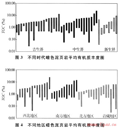 中國(guó)南方地區(qū)沉積厚度巨大并經(jīng)歷了多期次構(gòu)造運(yùn)動(dòng),后期改造、抬升剝蝕作用強(qiáng)烈。地史時(shí)期內(nèi)的深埋作用導(dǎo)致古生界海相源巖熱演化程度高,如下寒武統(tǒng)烴源巖Ro在大部分地區(qū)都大于3.0%,局部地區(qū)高達(dá)7.0%;下志留統(tǒng)R。集中在2.0%~3.0%,個(gè)別地區(qū)高達(dá)6.0%;二疊系有機(jī)質(zhì)Ro集中在1.0%~2.0%,局部地區(qū)可達(dá)3.3%。結(jié)合區(qū)域統(tǒng)計(jì)結(jié)果分析認(rèn)為,古生界黑色頁(yè)巖與中生界泥頁(yè)巖具有大致相同的有機(jī)質(zhì)豐度,大部分地區(qū)或盆地總有機(jī)碳含量平均值達(dá)到2.0%,而新生界泥頁(yè)巖有機(jī)質(zhì)含量總體較低且變化較快(圖3)。平面上,西北地區(qū)不同時(shí)代泥頁(yè)巖總有機(jī)碳含量平均值最高,北方最低(圖4)。宏觀上,中國(guó)產(chǎn)氣頁(yè)巖具有典型的高有機(jī)質(zhì)豐度、高熱演化程度及高后期變動(dòng)程度的“三高”特點(diǎn)。