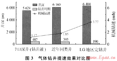 近兩年在15個構(gòu)造上累計實施氣體鉆井技術(shù)提速69口井、131井次,平均機械鉆速為12.73m/h,平均機械鉆速提高2~14倍。LG地區(qū)陸續(xù)開展44口井96井次的氣體鉆井作業(yè),總進尺為122318m,占LG地區(qū)鉆井總進尺的48.96%。LG地區(qū)已完鉆的25口井平均井深為6404m,平均鉆井周期為190d,氣體鉆井平均進尺比例為46.3%,完鉆井平均機械鉆速為3.77m/h,平均月速度為1012m/臺月。氣體鉆井技術(shù)的應(yīng)用使超深井鉆井能力得到極大提升,超深井鉆井速度實現(xiàn)重大突破,與近年同類井(6000m以上氣體鉆超深井七北101、黃金1、東升1等井)及近年常規(guī)鉆井液鉆超深井相比,技術(shù)指標大幅提高(圖3)。