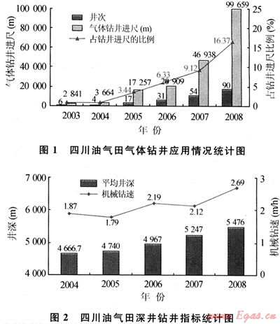 四川油氣田巖石可鉆性差,鉆井速度慢,“十五”期間平均機械鉆速為2.35m/h,深井、超深井平均機械鉆速為1.87m/h;此外,井漏頻繁、惡性井漏時有發(fā)生,2005年川渝地區(qū)井漏各種材料89992m3,因堵漏損失鉆井周期15.1臺月,井漏占復(fù)雜時率的60%;再就是低孔、低滲、低壓及水敏性油氣藏,鉆井過程中鉆井液往往造成儲層不可逆轉(zhuǎn)的傷害,造成油氣資源及勘探開發(fā)成本浪費,也嚴重地制約了勘探開發(fā)的進程[1]。針對以上難點,研究并試驗了氣體鉆井技術(shù),該技術(shù)已成為解決井漏、及時發(fā)現(xiàn)和保護油氣層及大幅度提高機械鉆速的關(guān)鍵技術(shù)。目前,四川油氣田氣體鉆井技術(shù)的應(yīng)用規(guī)模逐漸加大,氣體鉆井進尺比例逐年增加(圖1),深井、超深井整體機械鉆速大幅度提升(圖2),鉆井周期大幅降低,并形成了一套適合四川油氣田地質(zhì)特點的氣體鉆井系列技術(shù)。