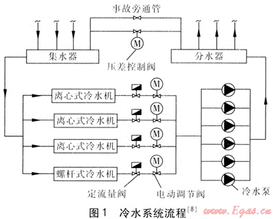 為了保證在部分負(fù)荷時冷水機(jī)組的高效運行,選用3臺離心式冷水機(jī)與1臺螺桿式冷水機(jī),在過渡季節(jié)或負(fù)荷較小時,只開啟螺桿式冷水機(jī)。冷水機(jī)進(jìn)出水溫度為13、7℃,冷水機(jī)與附屬設(shè)備見表1[8]。空調(diào)水系統(tǒng)為一次泵、末端變流量、機(jī)組側(cè)定流量系統(tǒng),采用二管制,豎向不分區(qū),末端空調(diào)裝置采用風(fēng)機(jī)盤管,冷水系統(tǒng)流程見圖1㈨。