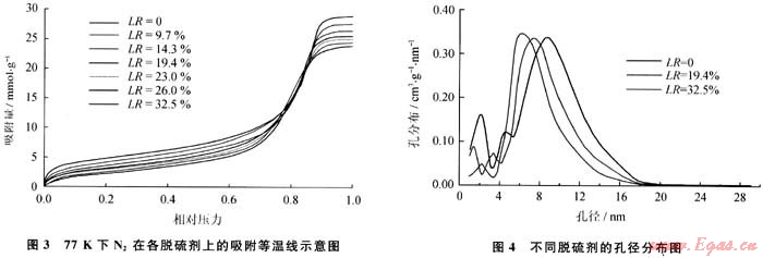77K下N2在各脫硫劑上的吸附等溫線見圖3,孔徑分布見圖4,計(jì)算出的比表面積和孔容見表1。