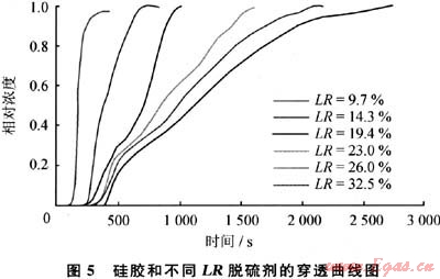 我國GB 17820一1999《天然氣》規(guī)定,城市管道天然氣中硫化氫含量標(biāo)準(zhǔn)為:一類天然氣中硫化氫含量不大于6mg/m3,二類天然氣中硫化氫含量不大于20mg/m3,三類天然氣中硫化氫含量小于460mg/m3。而GB 18047—2000《車用壓縮天然氣》規(guī)定,車用壓縮天然氣中硫化氫含量不大于15mg/m3。由圖5可以看出,LR>14.3%的脫硫劑,硫化氫穿透時(shí)間長于300s,即300s內(nèi)產(chǎn)品氣中不含硫化氫,符合一類城市管道天然氣和車用天然氣用氣要求。