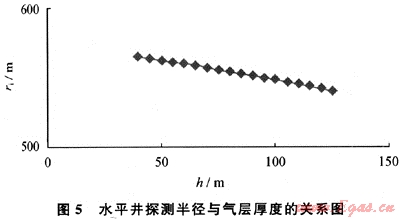 給定氣層厚度40~125m,其他參數(shù)同前,由式(8)得出探測半徑與氣層厚度的關(guān)系(圖5)??梢钥闯觯簹鈱雍穸仍龃螅綔y半徑減小,但減小的幅度很小。此即說明滲流截面積越大,壓力波向地層推進(jìn)越慢。