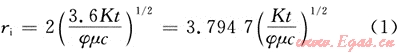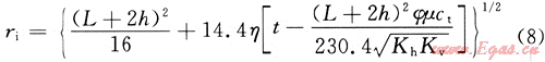 石油工業(yè)中國際上對于探測半徑的定義為:在某一確定的瞬時(shí),給井中施加一個壓力脈沖,對該脈沖響應(yīng)達(dá)到最大值的位置就稱為探測半徑。在標(biāo)準(zhǔn)單位制式下,探測半徑表示為[1]: