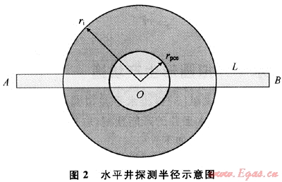 基于以上認(rèn)識和假設(shè),將水平井的探測半徑定義為:以水平段AB的中點(diǎn)為圓心0,以擬圓形生產(chǎn)坑道外緣半徑為基準(zhǔn),在生產(chǎn)過程壓力脈沖響應(yīng)達(dá)到的最大位置至圓心O的距離(圖2)。