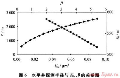 該水平井探測半徑存在一個基準(zhǔn)值,即水平井測試或生產(chǎn)完成垂直平面內(nèi)的徑向流時(shí)的探測半徑(擬圓形坑道的外緣半徑rpce)以及對應(yīng)的時(shí)間tpce測試或生產(chǎn)時(shí)間大于tpce時(shí)即可進(jìn)行計(jì)算。對于油氣藏儲集空間平面上表現(xiàn)出徑向復(fù)合的非均質(zhì)特征時(shí),可以先對儲層水平滲透率進(jìn)行平均后再進(jìn)行計(jì)算。實(shí)際計(jì)算結(jié)果表明,水平井探測半徑隨測試或生產(chǎn)時(shí)間及儲層滲透率的增大而增大,隨儲層厚度、水平段長度及各向異性系數(shù)的增大而降低。根據(jù)筆者提出的方法,不僅可以實(shí)時(shí)評價(jià)水平井的探測半徑、對油氣藏的控制程度,還可優(yōu)化水平井油藏工程設(shè)計(jì)、評價(jià)水平井開發(fā)的優(yōu)勢。